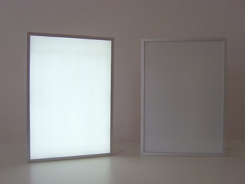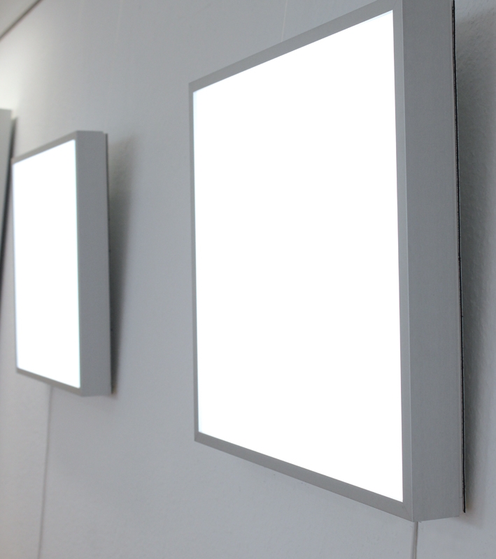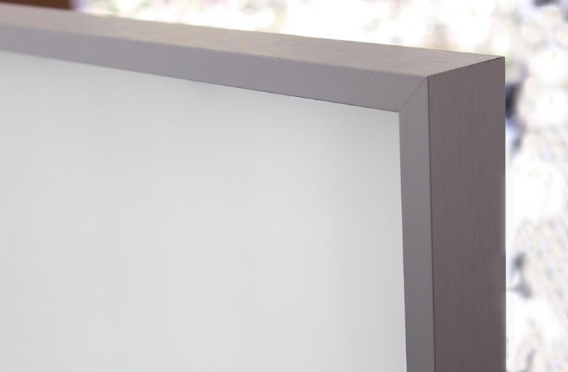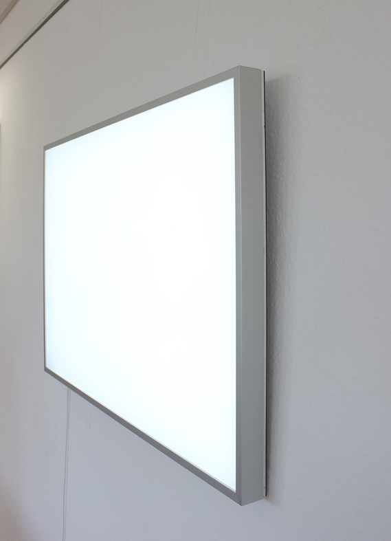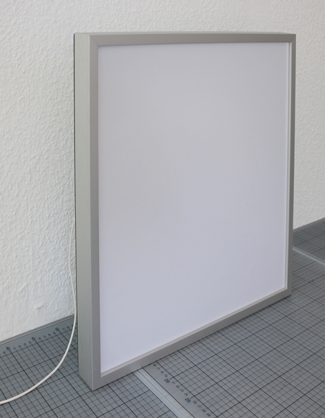 Leuchtrahmen Blanko in LED Technik bestehend aus Alurahmen in eloxal silber matt, Bautiefe 49 mm, SMD LEDs 12V, Pure White, 6000K, mit Netzteil und Dimmer mit Fernsteuerung 0-100%. Zwei Acrylscheiben antireflex, 1x für Bildträger und 1x matt klare Abdeckscheibe plus Diffusionsfolie. Zwischen die beiden Scheiben wird dann der Backlightdruck eingelegt.